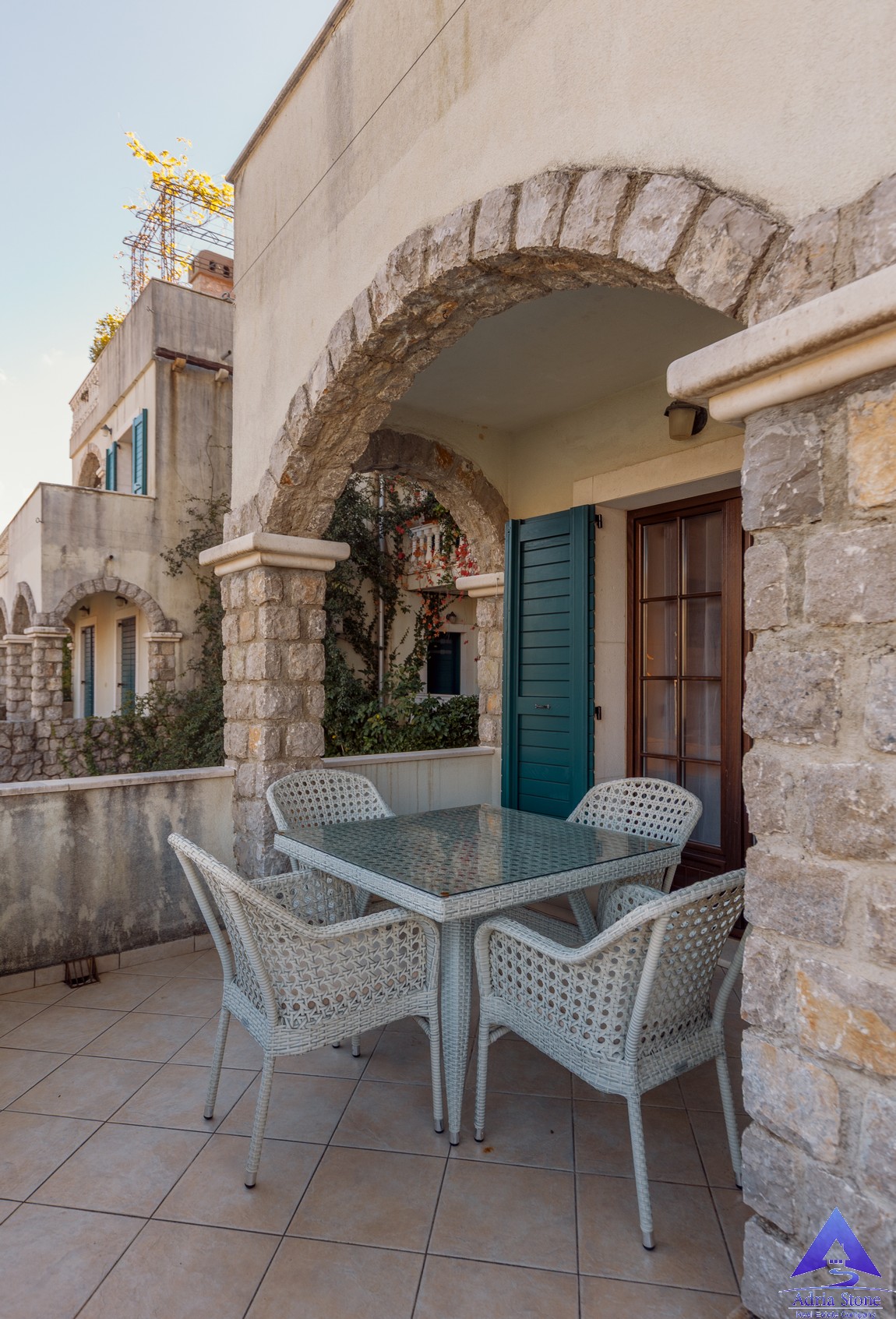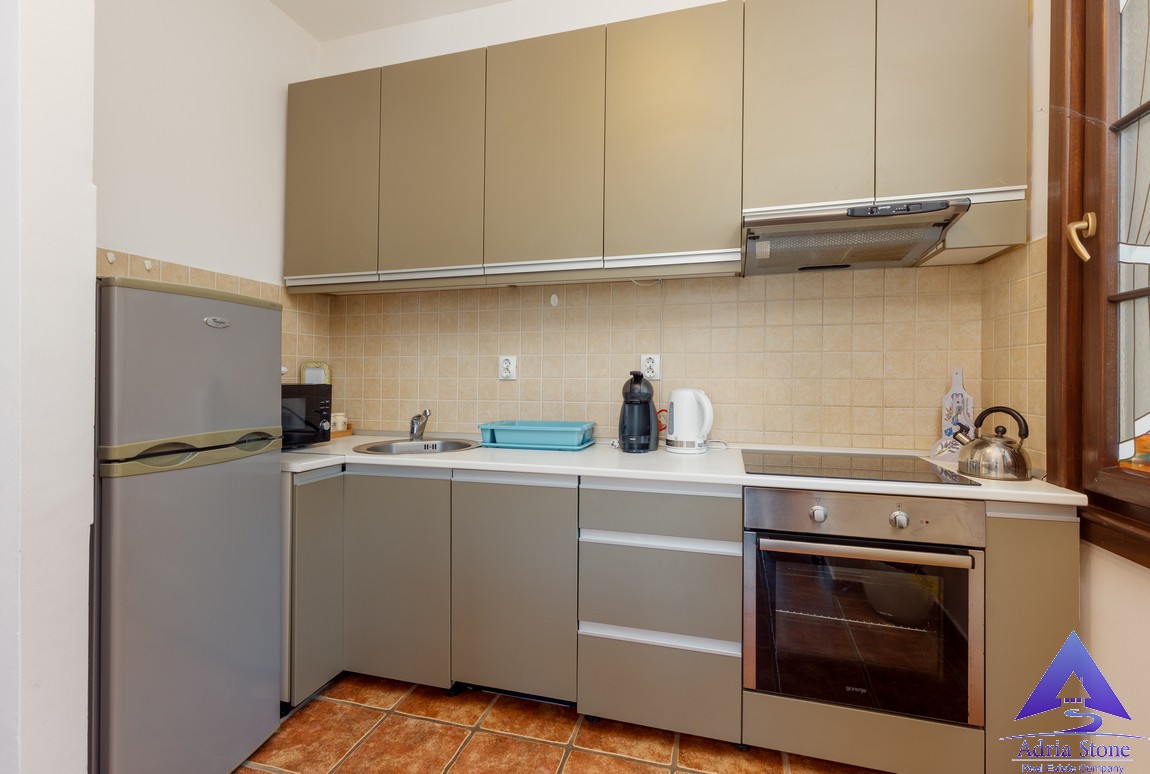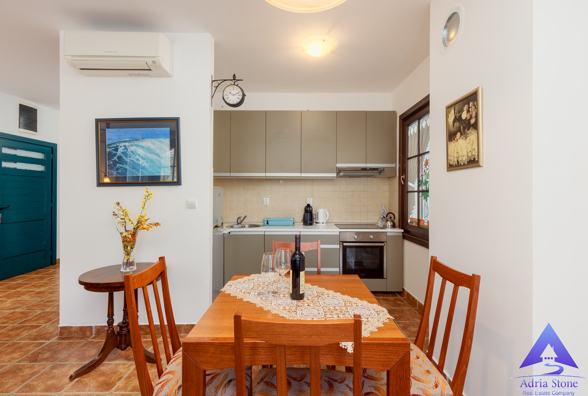 Na prodaju potpuno namješten dvosoban stan u ekskluzivnom stambenom kompleksu u Kostanjici, smješten na drugoj liniji od mora. Stan se nalazi na prvom spratu i ima 84m² unutrašnjeg prostora, kao i terasu od 16m² sa prelijepim otvorenim pogledom na more.