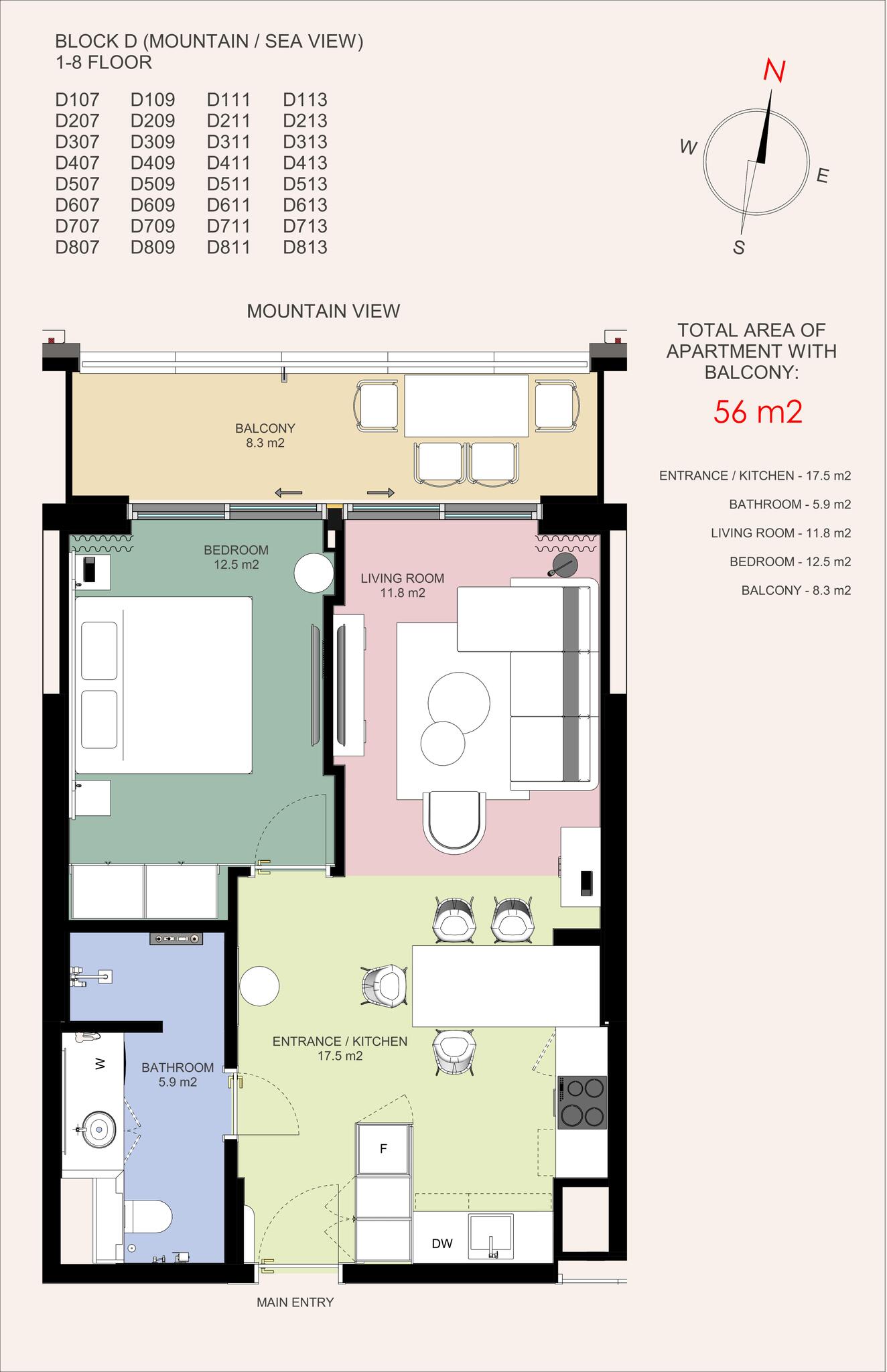 Ovaj jednosoban stan nalazi se na četvrtom spratu i prostire se na 56m². Stan nema pogled na more, ali pruža mirno i prijatno okruženje sa obiljem prirodne svjetlosti. Uređen u modernom mediteranskom stilu, stan je potpuno opremljen i odlikuje se svijetlim tonovima, savremenim detaljima i pažljivo biranim materijalima koji stvaraju toplu i elegantnu atmosferu.