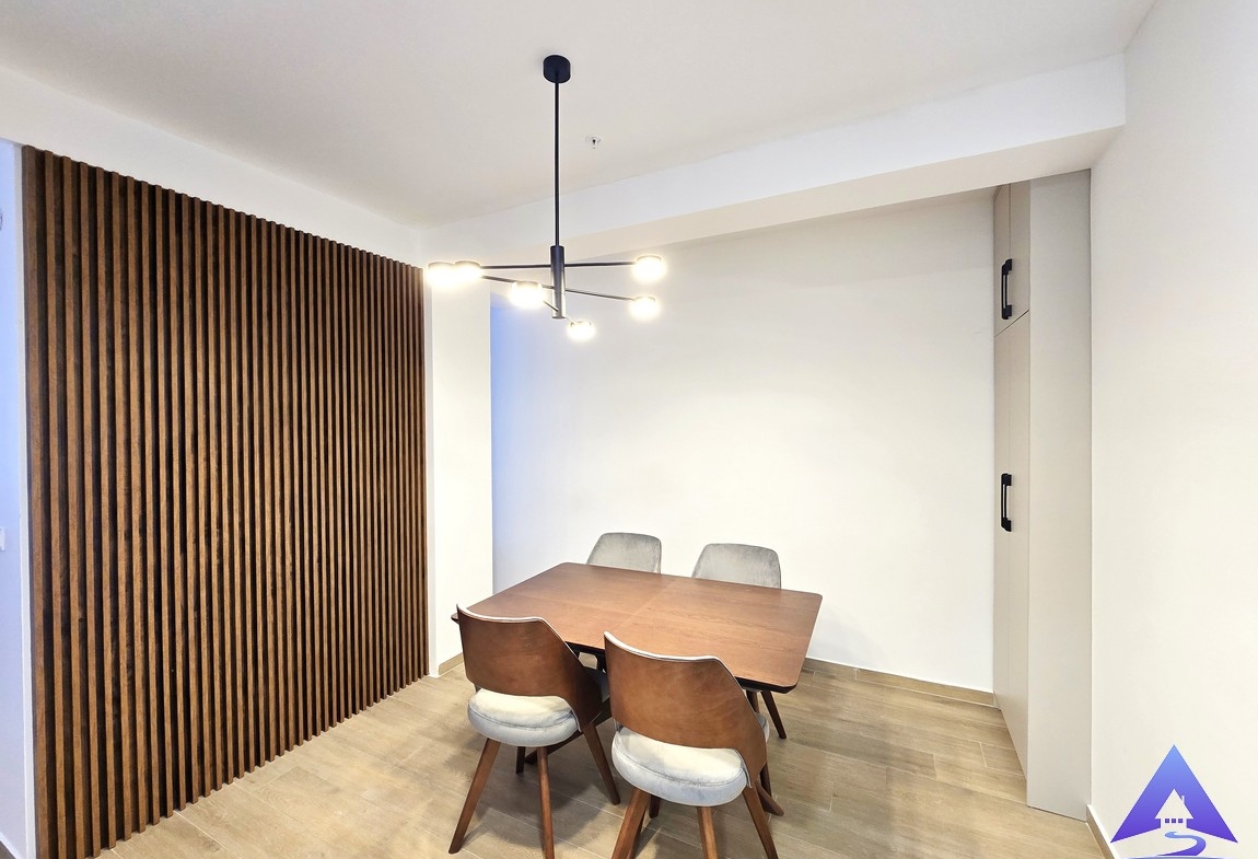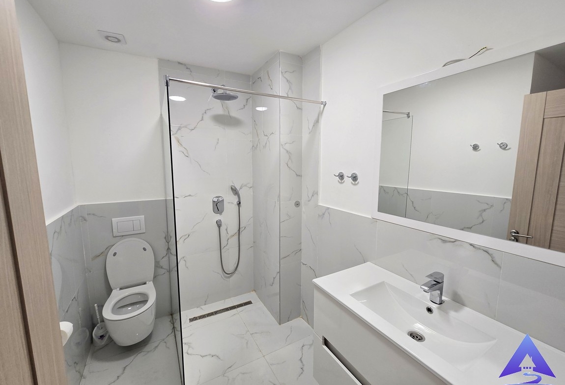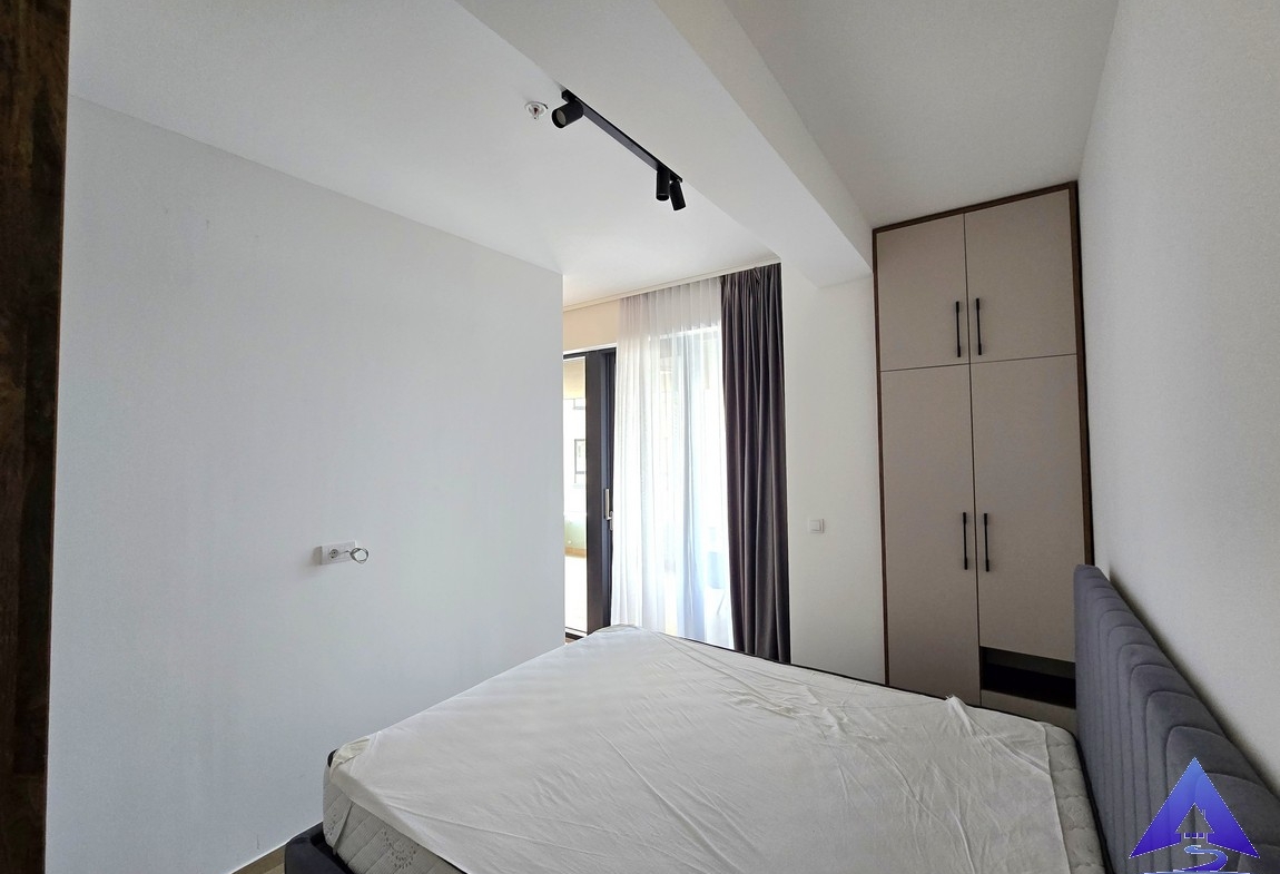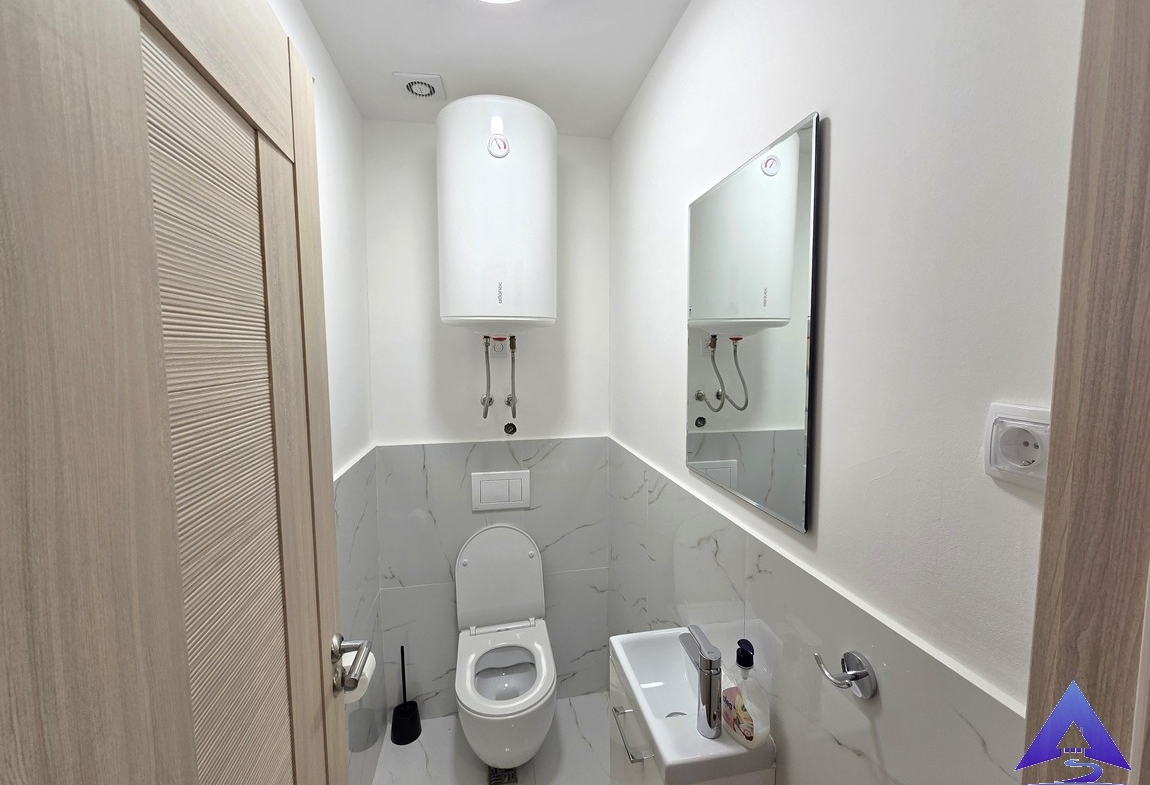 The apartment has a total area of 57m² and is south-oriented. It features a comfortable bedroom, a modern bathroom, and an additional guest toilet. The living area is functional, connected to a fully equipped kitchen with a bar counter.