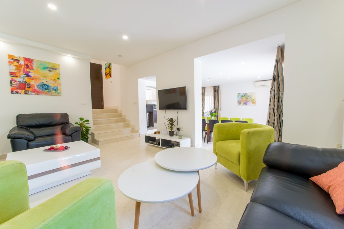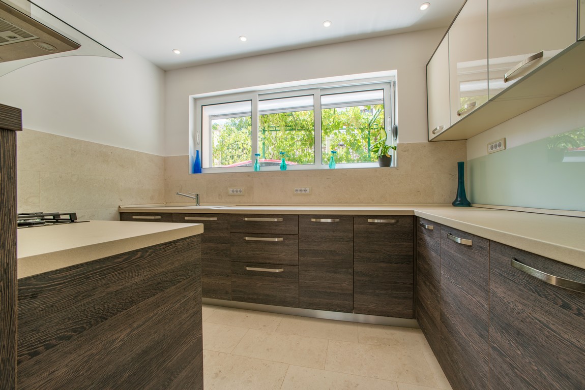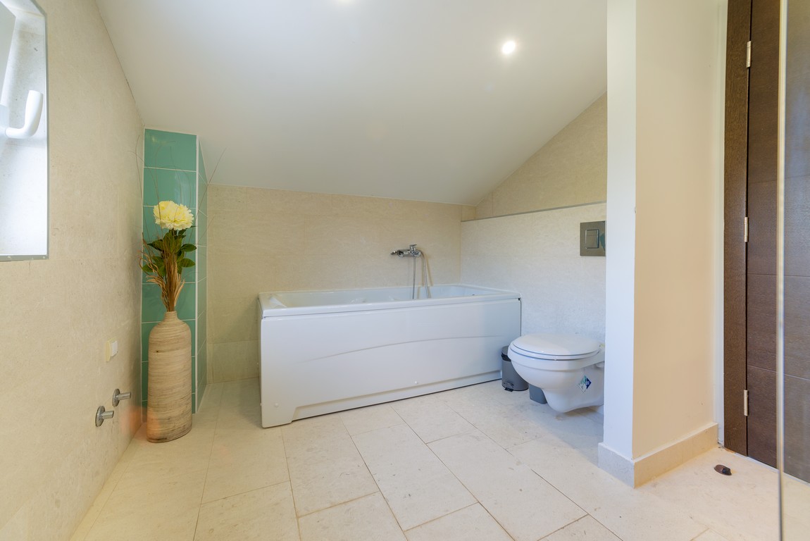 The interior is finished with high-quality materials: oak parquet flooring in the bedrooms, natural stone on the stairs and living room floor, and modern fixtures throughout. Each room is air-conditioned, and the villa is equipped with a fireplace, central heating, and a central boiler, ensuring year-round comfort.