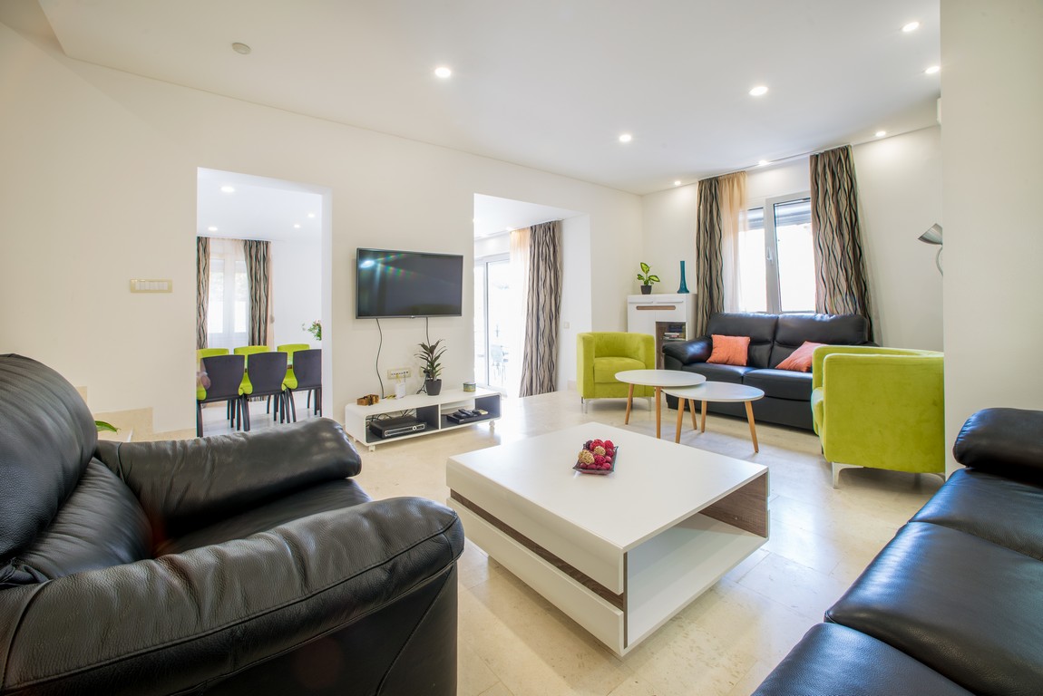 The spacious open-plan living room connects seamlessly to the kitchen and dining area, with large glass doors offering direct access to the beautifully landscaped yard. The outdoor area includes a 6.7 × 3.6 m swimming pool, 2.5 × 2.5 m jacuzzi, sunbathing deck, and plenty of space for relaxation and entertainment.