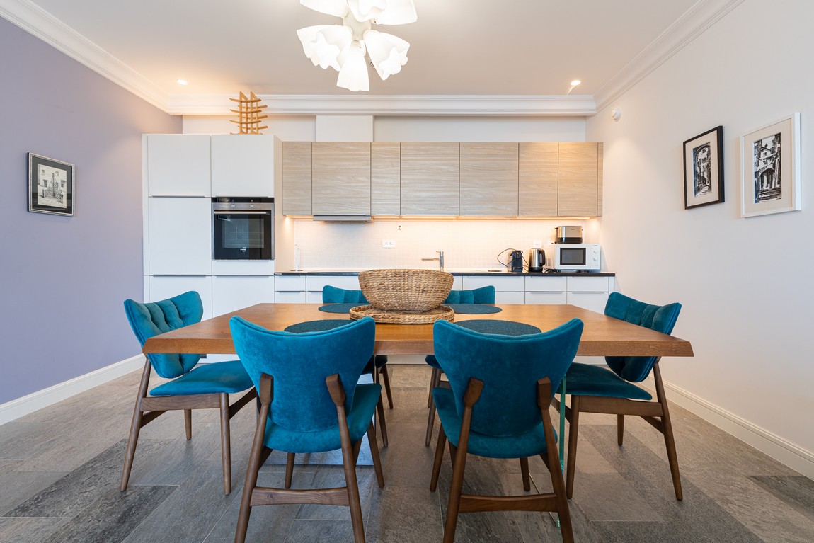 a bright open-plan living room, dining area, and fully equipped kitchen,