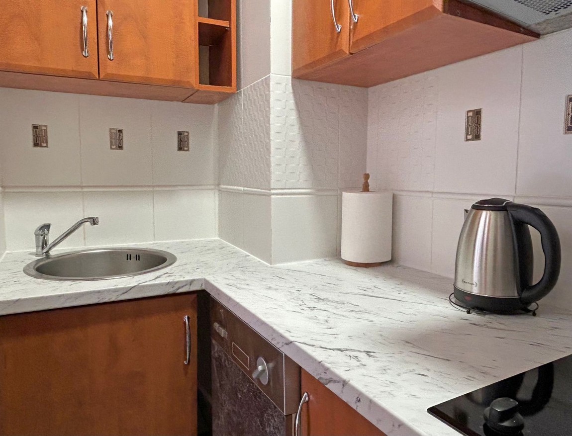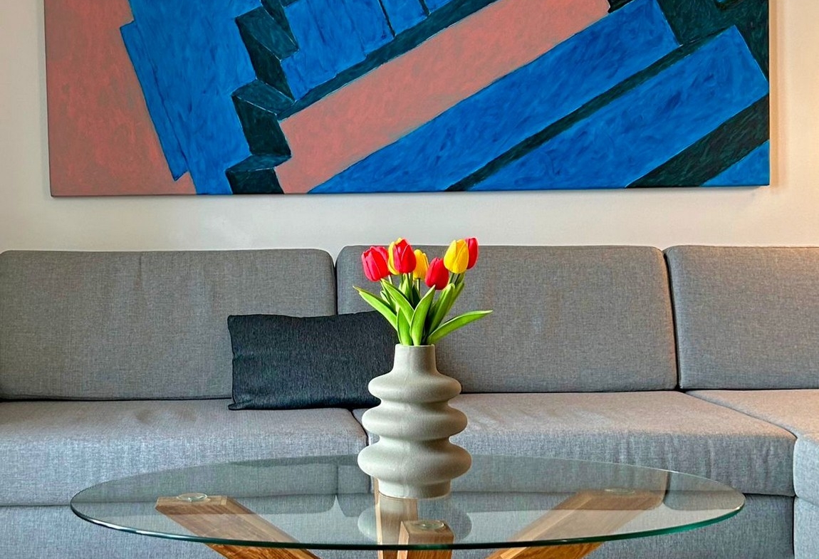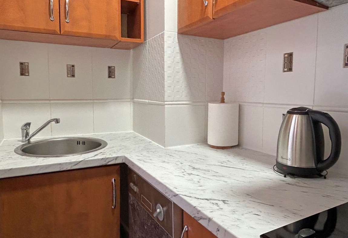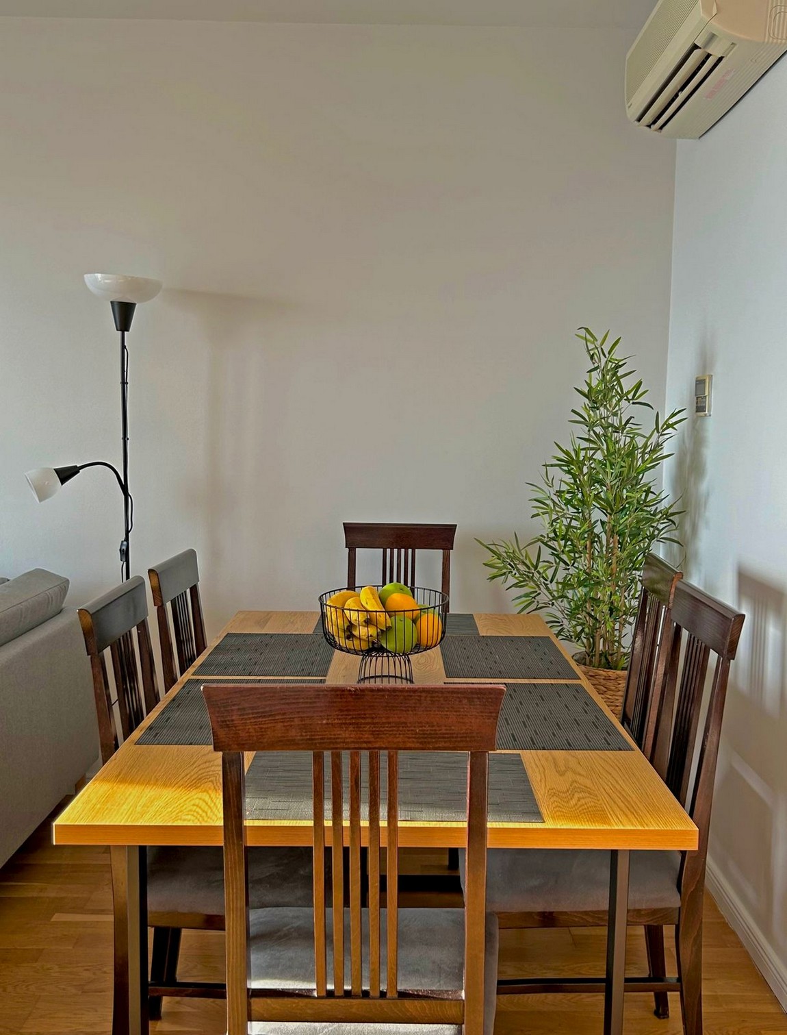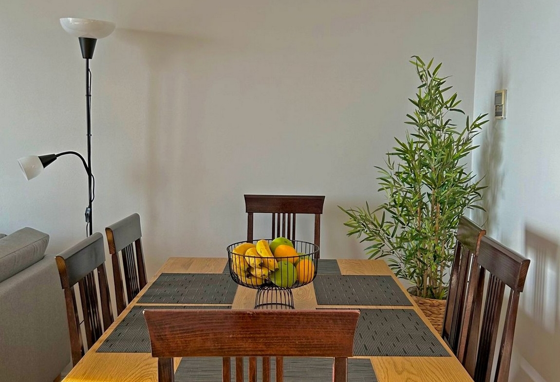 Spanning 65m², the apartment is fully furnished and thoughtfully designed for comfort and style. The bright living area features large windows that frame the spectacular sea view, creating a serene and relaxing ambiance. The open-plan layout connects the living room with a modern, fully equipped kitchen and dining area, ideal for everyday living or entertaining guests.