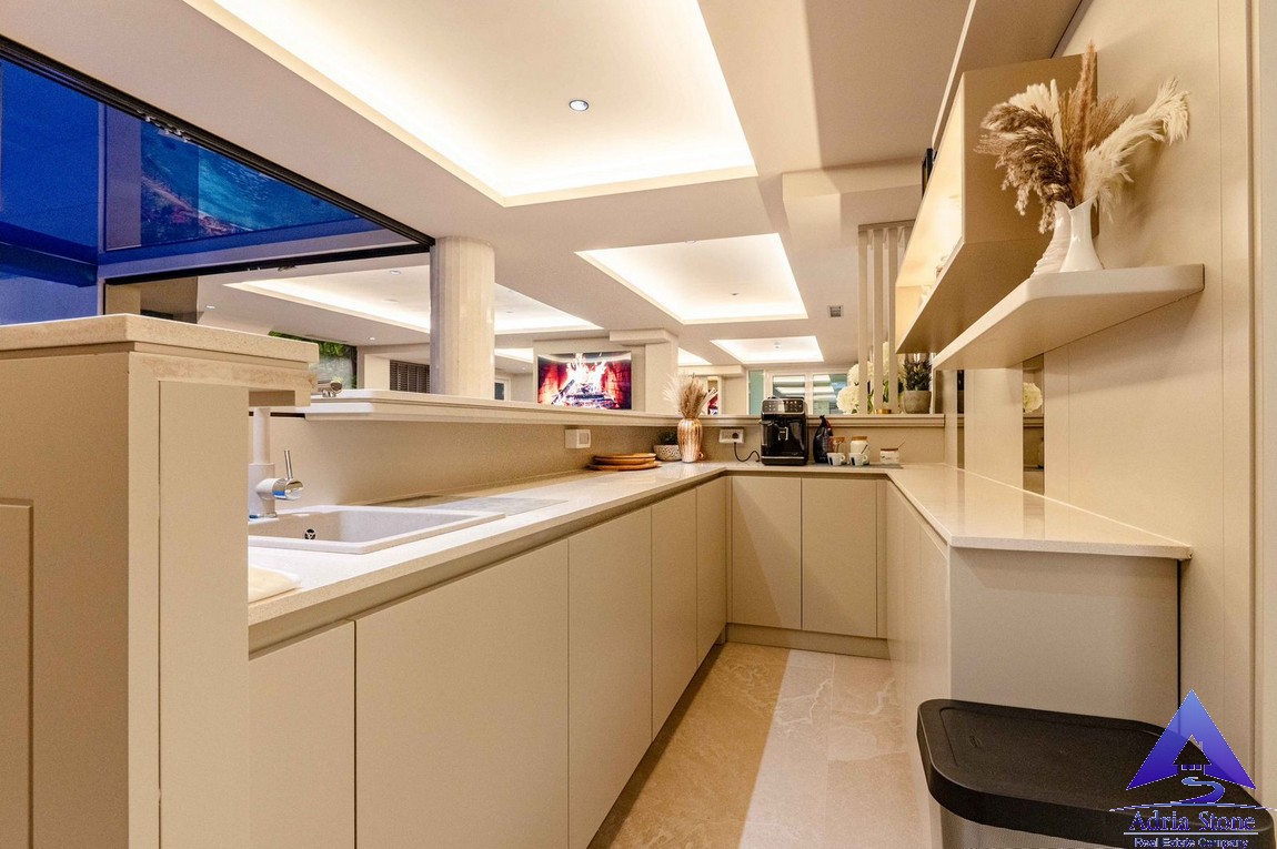 Полностью оборудованную кухню с барной стойкой и встроенной техникой
