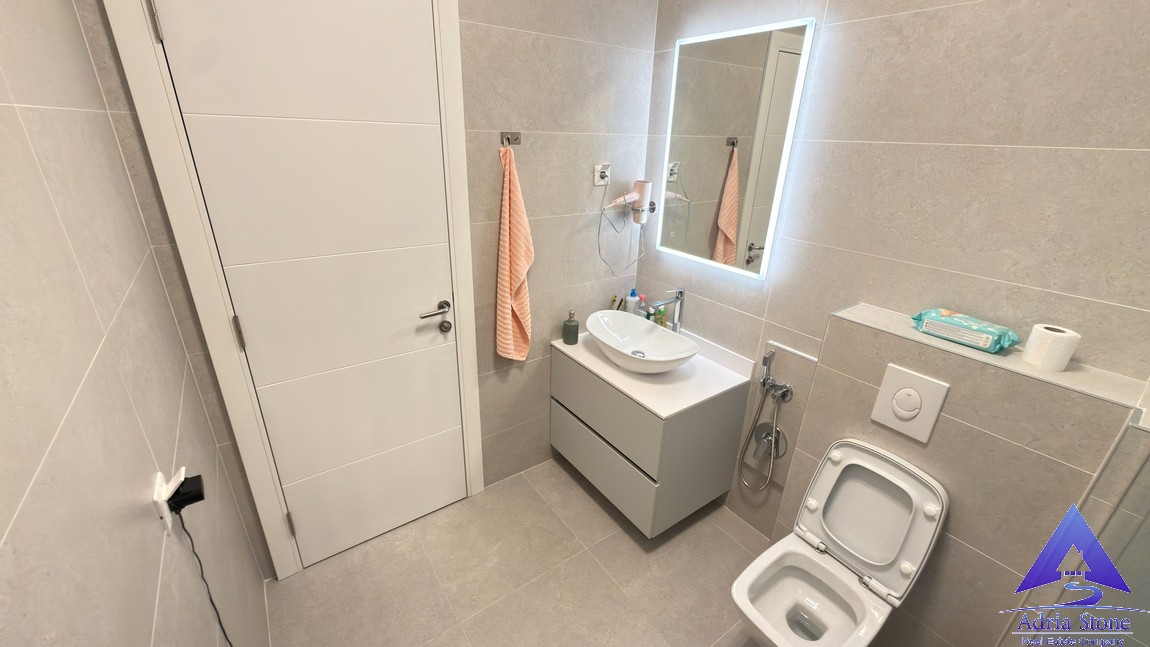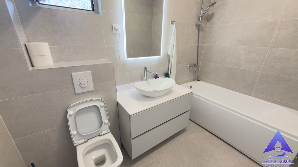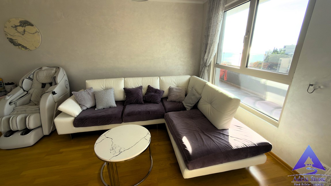 Благодаря продуманной планировке и юго-западной ориентации квартира отличается отличной инсоляцией и наполнена естественным светом в течение всего дня. Из гостиной и с просторной террасы открывается панорамный вид на море — от Завалы до Рафаиловичей, а также на остров Святого Николая.